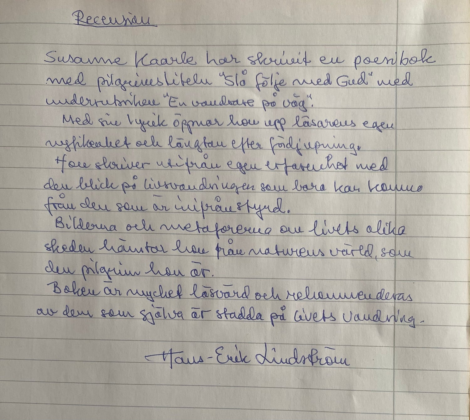 En diktbok kan lätt bli klyschig, pretentiös eller i värsta fall platt. Inte denna. Jag blir positivt överraskad för varje sida jag läser. Många av dikterna är på rim men de känns inte tillgjorda, tvärtom leker språket sig fram som en porlande bäck. Texterna är både lätta och djupa. Efter att ha läst boken känner jag att den är en god följeslagare på en resa, både en fysisk men också livets resa. Susanne föreslår att boken används i gudstjänster eller konfirmation, det tror jag också är passande. Det vita omslaget har en enkel illustration på framsidan som jag tolkar som en dörr, ett valv, ett fönster eller en spegel – vilken som hade passat temat. Susanne har en förmåga att tala sant och äkta om livet och jag tror att vi kommer få läsa mer av henne framöver.